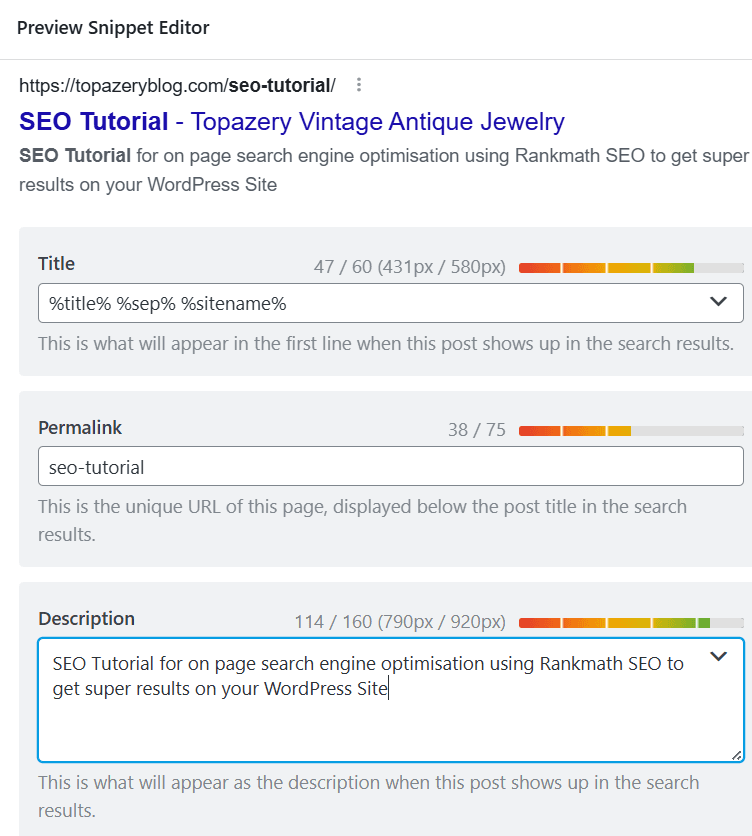What you see above on the first line is the title, the second line is a url in blue. This will contain the title which is chosen for the keywords you select using google keyword planner- you are looking for high volume low competition keywords in our case SEO Tutorial. Copy that and paste it here: